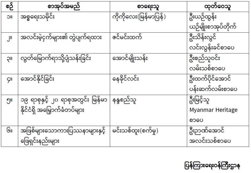 ​​​​​​​၂၀၁၄ ခုနှစ်၊ ပုံနှိပ်ခြင်းနှင့်ထုတ်ဝေခြင်းလုပ်ငန်းဥပဒေ၊ နည်းဥပဒေများအရ ထုတ်ဝေသူများသည် မိမိတို့ထုတ်ဝေသည့် စာအုပ်စာစောင် ၅ အုပ် သို့မဟုတ် ၅ စောင်ကို ပြန်ကြားရေးဝန်ကြီးဌာနသို့ အဖိုးအခလွတ်ပေးအပ်ရမည်ဖြစ်ပါသည်။