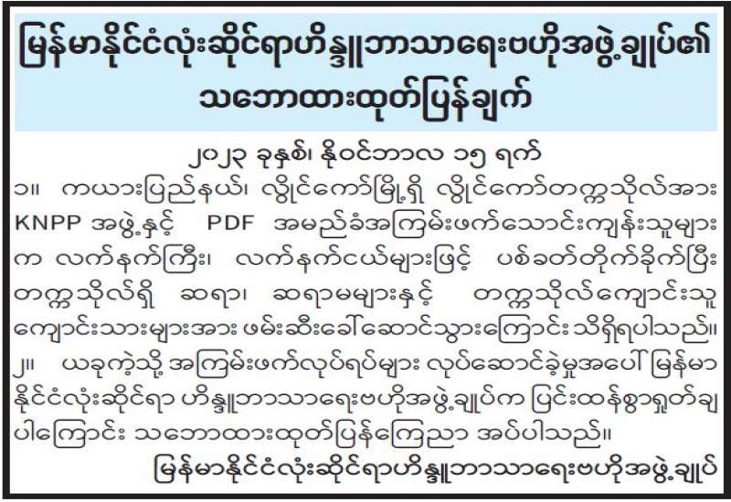 မြန်မာနိုင်ငံလုံးဆိုင်ရာ ထေရဝါဒဗုဒ္ဓဘာသာအဖွဲ့ချုပ်နှင့် နယ်စပ်တောင်တန်းဒေသ သာသနာနုဂ္ဂဟအသင်း (ဗဟို) ၏ သဘောထားထုတ်ပြန်ချက်
