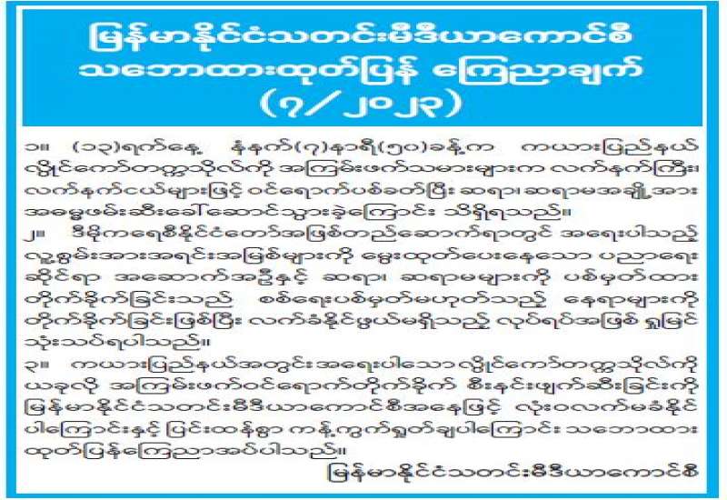 ယခုလတ်တလောကာလတွင် အများပြည်သူအကျိုးစီးပွားပျက်စီးစေရန် မသမာသူလူတစ်စုက လူမှုကွန်ယက်စာမျက်နှာများတွင် သတင်းမှားများ ဖြန့်ဝေလျက်ရှိကြောင်း သိရှိရပါသည်။ အဆိုပါ လူမှုကွန်ရက်စာမျက်နှာများနှင့် အင်တာနက် Website များတွင် ဖြန့်ဝေနေသော ဘဏ်များရှိ အပ်ငွေစာရင်းများမှ ငွေသားထုတ်ယူခြင်းများကို ကန့်သတ်နေကြောင်း ထုတ်ပြန်ချက်များသည် မဟုတ်မမှန်သောသတင်းမှားများသာ ဖြစ်ကြပါသည်။ အလားတူ အချို့ပုဂ္ဂလိကဘဏ်များတွင် ဝန်ထမ်းများကို လစာများကြိုတင် ထုတ်ပေးကြောင်း သတင်းများသည်လည်း သတင်းမှား များဖြစ်ကြပါသည်။