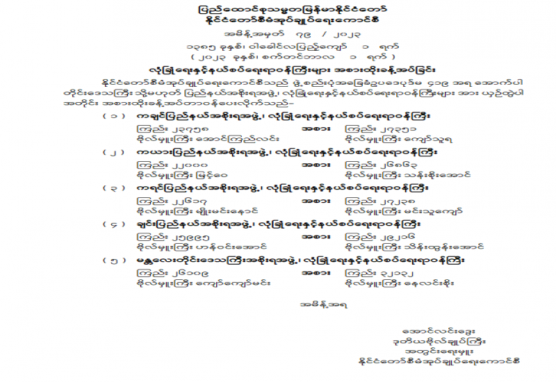 ကချင်ပြည်နယ်တရားလွှတ်တော် တရားသူကြီး ခန့်အပ်တာဝန်ပေးခြင်း