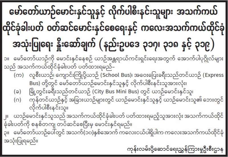 မော်တော်ယာဉ်မောင်းနှင်သူနှင့် လိုက်ပါစီးနင်းသူများ အသက်ကယ်ထိုင်ခုံခါးပတ် ဝတ်ဆင်မောင်းနှင်စေရေးနှင့် ကလေးအသက်ကယ်ထိုင်ခုံ အသုံးပြုရေးနှိုးဆော်ချက် (နည်းဥပဒေ ၃၁၇၊ ၃၁၈ နှင့် ၃၁၉)