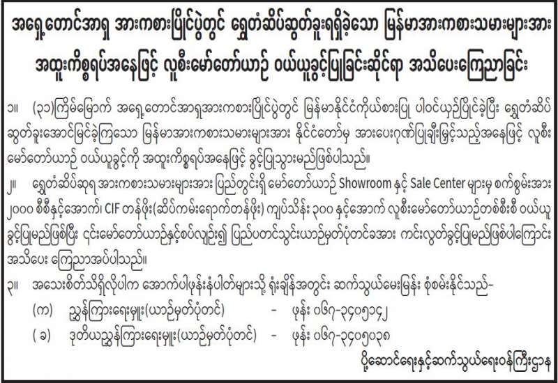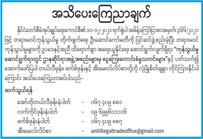 ပြန်ကြားရေးဝန်ကြီးဌာနသည် အရေးကြီးကုန်စည်နှင့် ဝန်ဆောင်မှု ဥပဒေပုဒ်မ ၄ ပုဒ်မခွဲ(ဂ)အရ အပ်နှင်းထားသော လုပ်ပိုင်ခွင့်များကို ကျင့်သုံး၍ (၃၀-၃-၂၀၂၁) ရက်နေ့တွင် တေးသံသွင်းလုပ်ငန်းလုပ်ကိုင် ခွင့်အမိန့်၊ အမိန့်အမှတ် (၂/၂၀၂၁)ဖြင့် တေးသံသွင်းလုပ်ငန်း လုပ်ကိုင်ခွင့်မှတ်ပုံတင် လက်မှတ်များအား (၁)နှစ် သက်တမ်းဖြင့် ခွင့်ပြုပေးလျက်ရှိပါသည်။