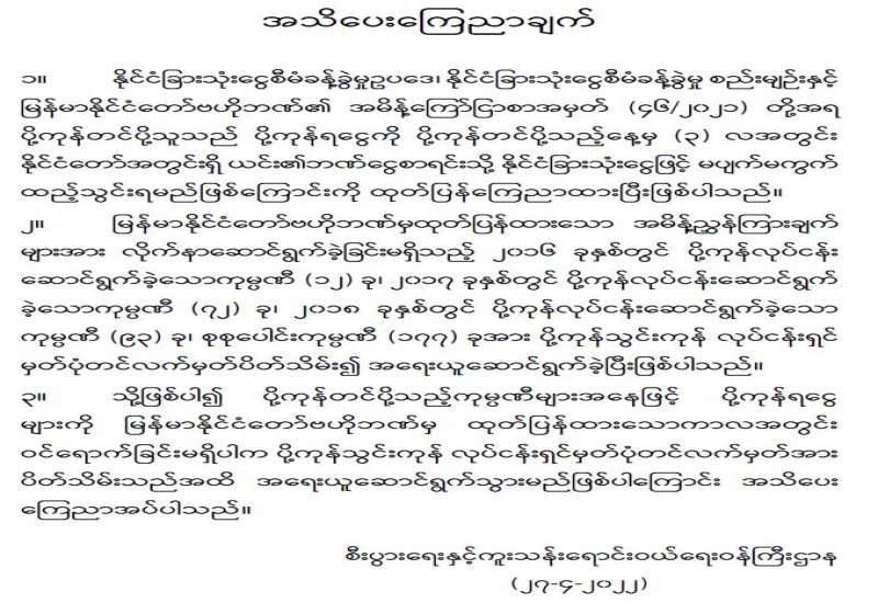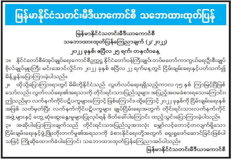 နိုင်ငံခြားသုံးငွေ စီမံခန့်ခွဲမှုနှင့် စပ်လျဉ်း၍ စီးပွားရေးနှင့်ကူးသန်းရောင်းဝယ်ရေးဝန်ကြီးဌာန က အသိပေးကြေညာ