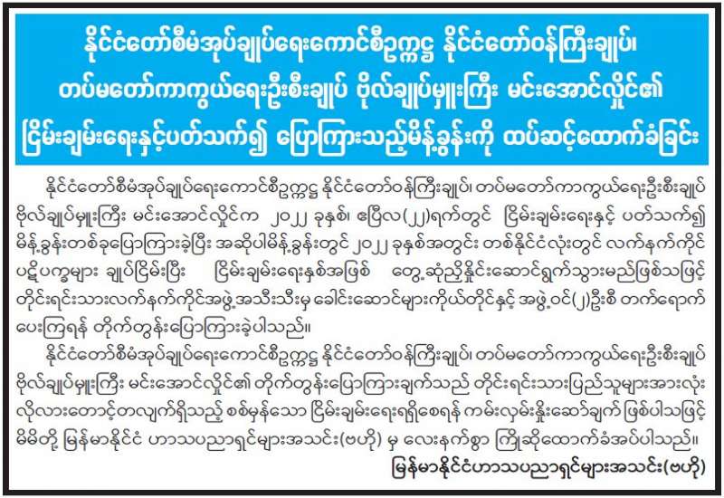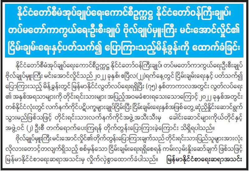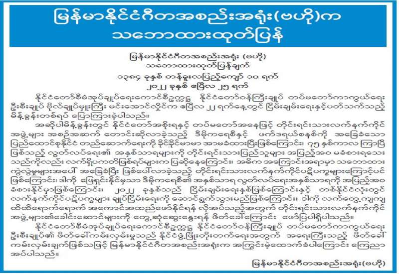 နိုင်ငံတော်စီမံအုပ်ချုပ်ရေးကောင်စီဥက္ကဋ္ဌ နိုင်ငံတော်ဝန်ကြီးချုပ်၊ တပ်မတော်ကာကွယ်ရေး ဦးစီးချုပ် ဗိုလ်ချုပ်မှူးကြီး မင်းအောင်လှိုင်၏ ငြိမ်းချမ်းရေးနှင့်ပတ်သက်၍ ပြောကြားချက်များအပေါ် မြန်မာနိုင်ငံသတင်းမီဒီယာကောင်စီက ကြိုဆိုထောက်ခံကြောင်း ထုတ်ပြန်ကြေညာ
