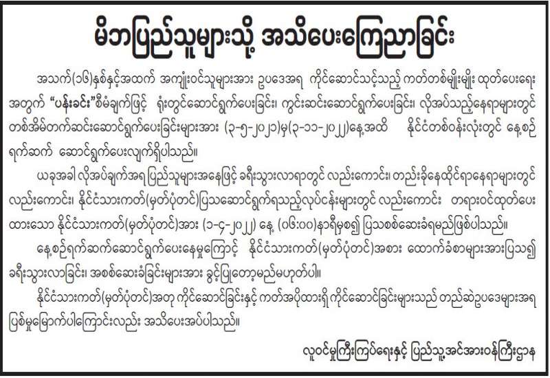 မိဘပြည်သူများသို့ အသိပေးကြေညာခြင်း