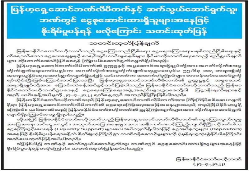 မြန်မာ့ရှေ့ဆောင်ဘဏ်လီမိတက်နှင့် ဆက်သွယ်ဆောင်ရွက်သူ၊ ဘဏ်တွင် ငွေစုဆောင်းထားရှိသူများအနေဖြင့် စိုးရိမ်ပူပန်ရန် မလိုကြောင်း သတင်းထုတ်ပြန်