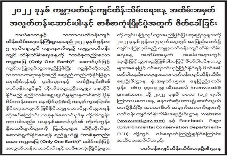 ၂၀၂၂ ခုနှစ် ကမ္ဘာ့ပတ်ဝန်းကျင်ထိန်းသိမ်းရေးနေ့ အထိမ်းအမှတ် အလွတ်တန်းဆောင်းပါးနှင့် စာစီစာကုံးပြိုင်ပွဲအတွက် ဖိတ်ခေါ်ခြင်း