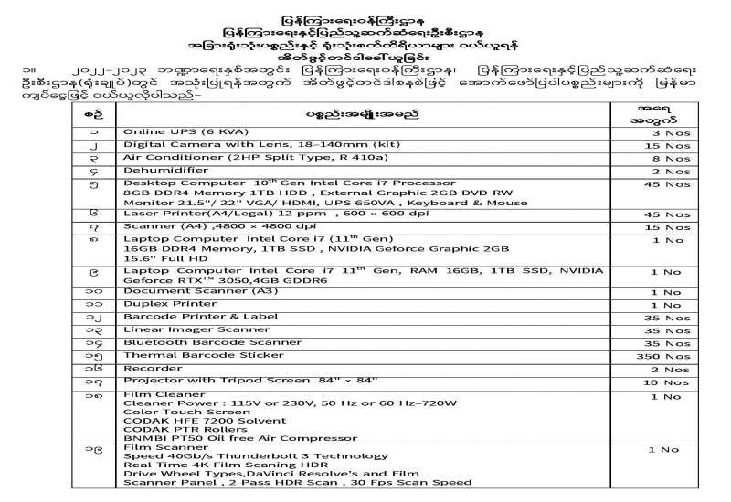 အခြားရုံးသုံးပစ္စည်းနှင့် ရုံးသုံးစက်ကိရိယာများ ဝယ်ယူရန် အိတ်ဖွင့်တင်ဒါခေါ်ယူခြင်း