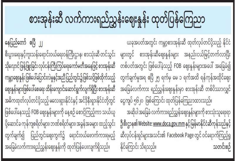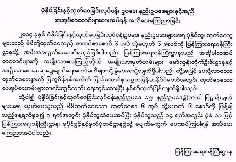 ပုံနှိပ်ခြင်းနှင့်ထုတ်ဝေခြင်းလုပ်ငန်း ဥပဒေ၊ နည်းဥပဒေများနှင့်အညီ စာအုပ်စာစောင်များပေးအပ်ရန် အသိပေးကြေညာခြင်း