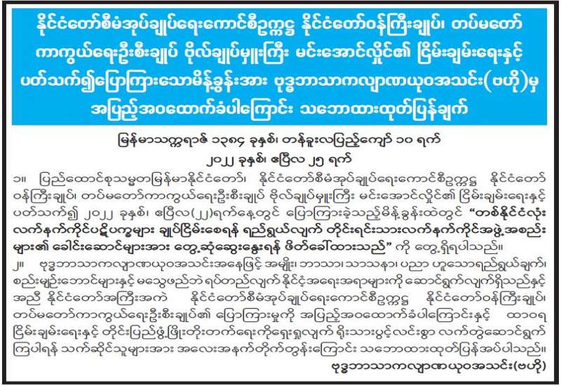 တပ်မတော်အနေဖြင့် ပြည်သူလူထုတစ်ရပ်လုံး လိုလားတောင့်တလျက်ရှိသည့် ထာဝရငြိမ်းချမ်းရေးရရှိရန် ဦးတည်၍ ၂၀၂၂ ခုနှစ် နှစ်ကုန်ပိုင်း အထိ ပစ်ခတ်တိုက်ခိုက်မှုများကို ရပ်စဲပေးထားပြီး အဘက်ဘက်မှ ကြိုးပမ်းဆောင်ရွက်လျက်ရှိသည်။