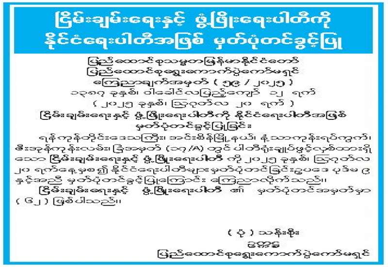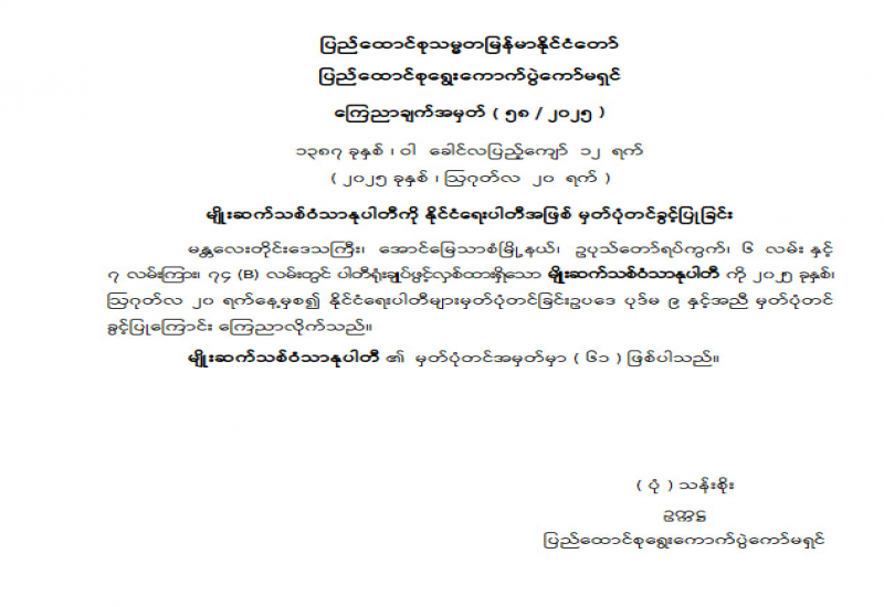 လွှတ်တော်အသီးသီးအတွက် ပါတီစုံဒီမိုကရေစီအထွေထွေရွေးကောက်ပွဲများ ကျင်းပမည့် အပိုင်းလိုက်နေ့ရက်များကို သတ်မှတ်ကြေညာခြင်း