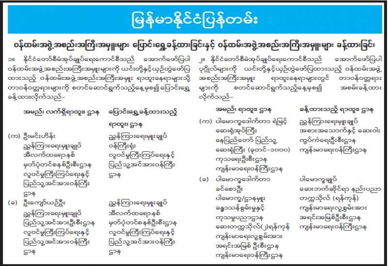 ဝန်ထမ်းအဖွဲ့အစည်းအကြီးအမှူးများ ပြောင်းရွှေ့ခန့်ထားခြင်းနှင့် ဝန်ထမ်းအဖွဲ့အစည်း အကြီးအမှူး များ ခန့်ထားခြင်း