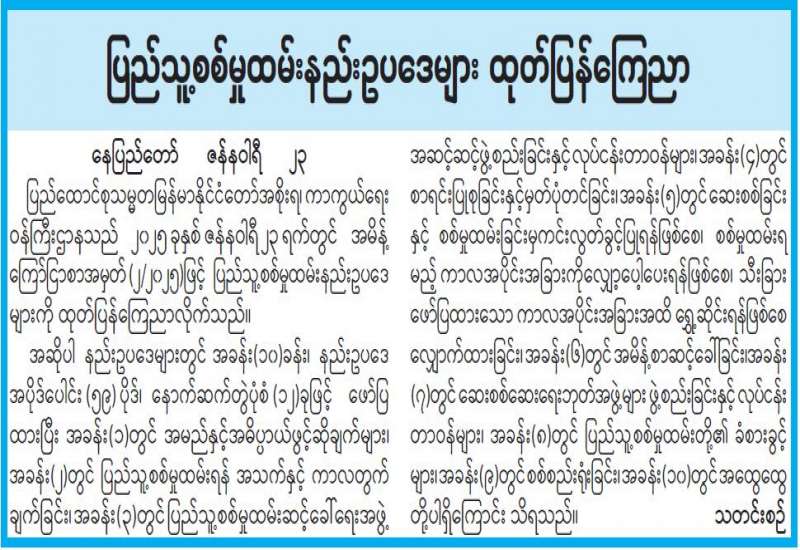 ၁။ ပြန်ကြားရေးဝန်ကြီးဌာနအနေဖြင့် ပုံနှိပ်ခြင်းနှင့် ထုတ်ဝေခြင်းလုပ်ငန်းနည်းဥပဒေများ ထွက်ရှိသည့် ၁၀-၁၀-၂၀၁၄ ရက်နေ့မှစ၍ ပုံနှိပ်ခြင်း၊ ထုတ်ဝေခြင်းနှင့် သတင်းအေဂျင်စီလုပ်ငန်း အသိအမှတ်ပြုလက်မှတ်များအား ၅ နှစ် သက်တမ်းခွင့်ပြုပေးခဲ့ပါသည်။