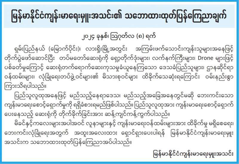 ၁။ ပြည်သူအတွက်ဟု သုံးနှုန်း၍ ရဟန်းသံဃာများ၊ ဆရာ၊ ဆရာမများအပါအဝင် နိုင်ငံ့ဝန်ထမ်းများနှင့် ပြည်သူကိုသတ်ဖြတ်၊ လုယက်ခြင်းကို CRPH၊ NUG၊ PDF အမည်ခံ အကြမ်းဖက်အုပ်စုများက ဥပဒေမဲ့ကျူးလွန်နေသည်။