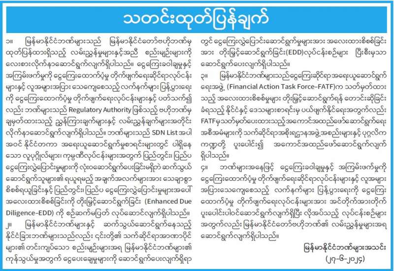 ၁။ မြန်မာနိုင်ငံဘဏ်များသည် မြန်မာနိုင်ငံတော်ဗဟိုဘဏ်မှ ထုတ်ပြန်ထားရှိသည့် လမ်းညွှန်မှုများနှင့်အညီ စည်းမျဉ်းများကို လေးစားလိုက်နာဆောင်ရွက်လျက်ရှိပါသည်။ ငွေကြေးခဝါချမှုနှင့်အကြမ်းဖက်မှုကို ငွေကြေးထောက်ပံ့မှု တိုက်ဖျက်ရေးဆိုင်ရာလုပ်ငန်းများနှင့် လူအများအပြား သေကျေစေသည့် လက်နက်များပြန့်ပွားရေးကို ငွေကြေးထောက်ပံ့မှု တိုက်ဖျက်ရေးလုပ်ငန်းများနှင့်ပတ်သက်၍လည်း ဘဏ်များသည် Regulatory Authority ဖြစ်သည့် ဗဟိုဘဏ်မှချမှတ်ထားသည့် ညွှန်ကြားချက်များနှင့် လမ်းညွှန်ချက်များအတိုင်း လိုက်နာဆောင်ရွက်လျက်ရှိပါသည်။ ဘဏ်များသည် SDN List အပါအဝင် နိုင်ငံတကာ အရေးယူဆောင်ရွက်မှုစာရင်းများတွင် ပါရှိနေသော လူပုဂ္ဂိုလ်များ၊ ကုမ္ပဏီလုပ်ငန်းများအတွက် ပြည်တွင်း၊ ပြည်ပငွေကြေးလွှဲပြောင်းမှုများကို လုံးဝဆောင်ရွက်ပေးခြင်းမရှိဘဲ ဆက်သွယ်ဆောင်ရွက်သူများ၏ ရယူရမည့်အချက်အလက်များအား သေချာစွာစိစစ်ရယူခြင်းနှင့် ပြည်တွင်း၊ ပြည်ပငွေကြေးလွှဲပြောင်းမှုများအပေါ် အလေးထားစိစစ်ခြင်းကို တိုးမြှင့်ဆောင်ရွက်ခြင်း (Enhanced Due Diligence-EDD) ကို စဉ်ဆက်မပြတ် လုပ်ဆောင်လျက်ရှိပါသည်။
