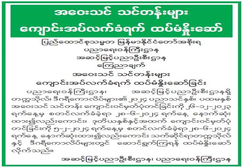 ပညာရေးဝန်ကြီးဌာန၊ အဆင့်မြင့်ပညာဦးစီးဌာနရှိ တက္ကသိုလ်၊ ဒီဂရီကောလိပ်များ၏ ၂၀၂၄ ပညာသင်နှစ်၊ ပထမနှစ် အဝေးသင်သင်တန်း ကျောင်းဝင်မှတ်ပုံတင်ခြင်းကို ၂၆-၁၂-၂ဝ၂၃ ရက်နေ့မှ စတင်လက်ခံခဲ့ရာ ၂၈-၆-၂ဝ၂၄ ရက်နေ့ နောက်ဆုံးထား၍လည်းကောင်း၊ ဒုတိယနှစ်နှင့်အထက် ကျောင်းဝင်မှတ်ပုံတင်ခြင်းကို ၅-၂-၂၀၂၄ ရက်နေ့မှ စတင်လက်ခံခဲ့ရာ ၂၈-၆-၂၀၂၄ ရက်နေ့ နောက်ဆုံးထား၍လည်းကောင်း သက်ဆိုင်ရာတက္ကသိုလ်နှင့် ဒီဂရီကောလိပ်များတွင် ဆောင်ရွက်ကြရန် ထပ်မံနှိုးဆော်လိုက်သည်။