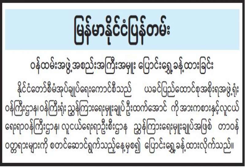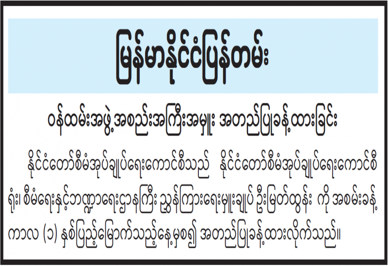 ပြည်ထောင်စုသမ္မတ မြန်မာနိုင်ငံတော် ပြည်ထောင်စုရွေးကောက်ပွဲကော်မရှင်သည် အမိန့်ကြော်ငြာစာအမှတ်(၁၂/၂၀၂၄)ဖြင့် “နိုင်ငံရေးပါတီများ မှတ်ပုံတင်ခြင်းနည်းဥပဒေများကို ပြင်ဆင်သည့်နည်းဥပဒေများ”ကို ၁၃၈၅ ခုနှစ် တပို့တွဲလပြည့်ကျော် ၁၀ ရက်၊ ၂၀၂၄ ခုနှစ် မတ်လ ၅ ရက် ရက်စွဲဖြင့် ထုတ်ပြန်ကြေညာခဲ့သည်။ အဆိုပါနည်းဥပဒေများကို နေ့စဉ်ထုတ်သတင်းစာများတွင် ထည့်သွင်းဖော်ပြပေးသွားမည်ဖြစ်ပြီး ပြည်ထောင်စုရွေးကောက်ပွဲကော်မရှင်ရုံး Website ဖြစ်သည့် www.uec.gov.mm တွင် Download ပြုလုပ်၍ ရယူနိုင်ကြောင်း သတင်းရရှိသည်။