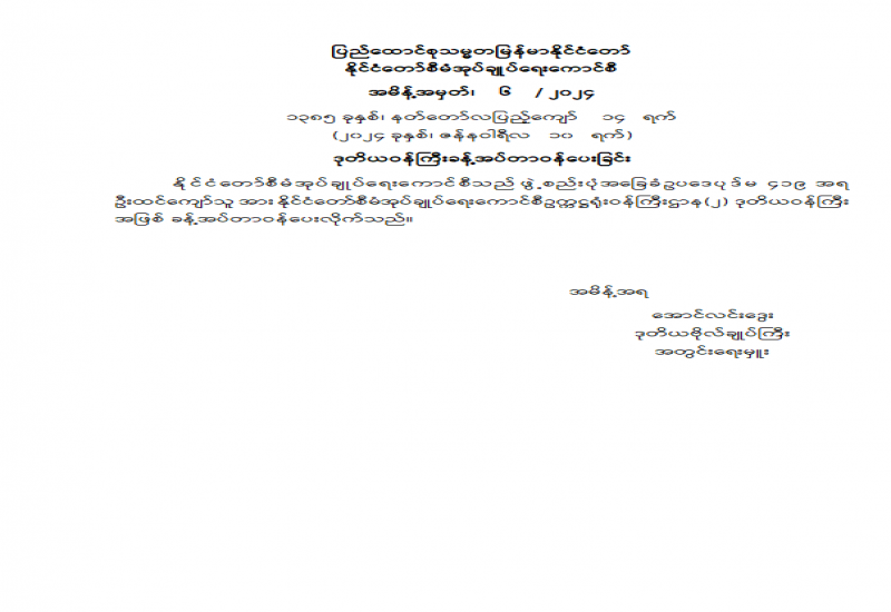 ပြည်ထောင်စုသမ္မတမြန်မာနိုင်ငံတော် နိုင်ငံတော်စီမံအုပ်ချုပ်ရေးကောင်စီ အမိန့်အမှတ်၊ ၆ / ၂၀၂၄ ၁၃၈၅ ခုနှစ်၊ နတ်တော်လပြည့်ကျော် ၁၄ ရက် (၂၀၂၄ ခုနှစ်၊ ဇန်နဝါရီလ ၁၀ရက်) ဒုတိယဝန်ကြီးခန့်အပ်တာဝန်ပေးခြင်း
