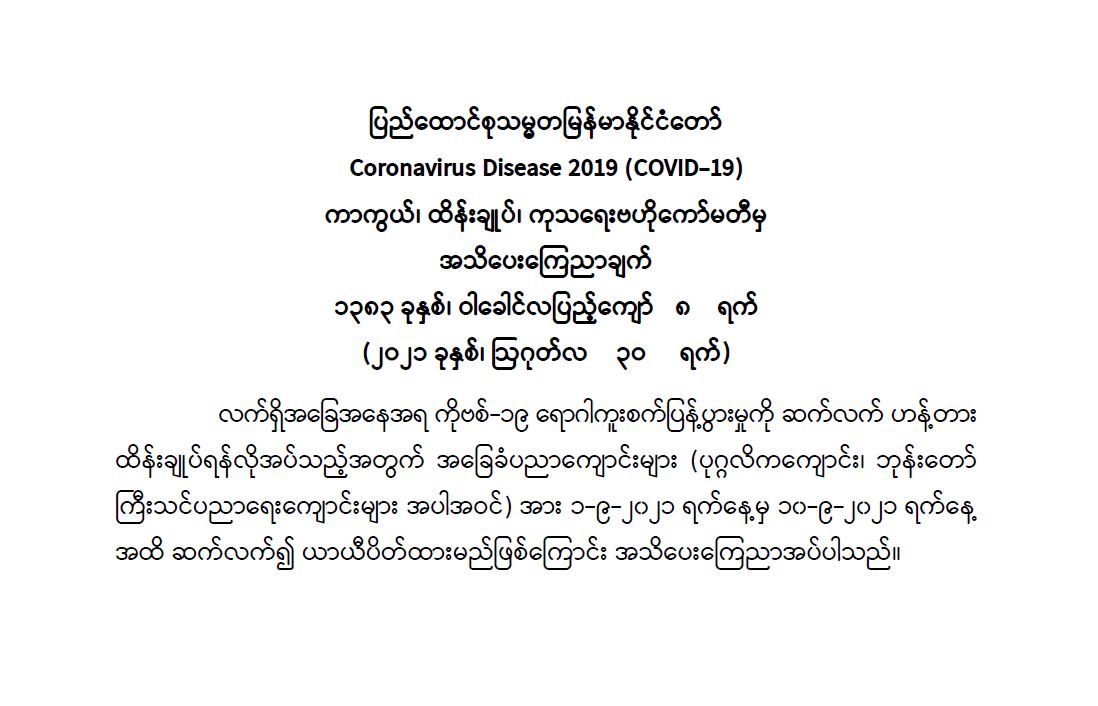 ပြည်ထောင်စုသမ္မတမြန်မာနိုင်ငံတော် Coronavirus Disease 2019 (COVID-19) ကာကွယ်၊ ထိန်းချုပ်၊ ကုသရေးဗဟိုကော်မတီမှ အသိပေးကြေညာချက် 08/30/2021