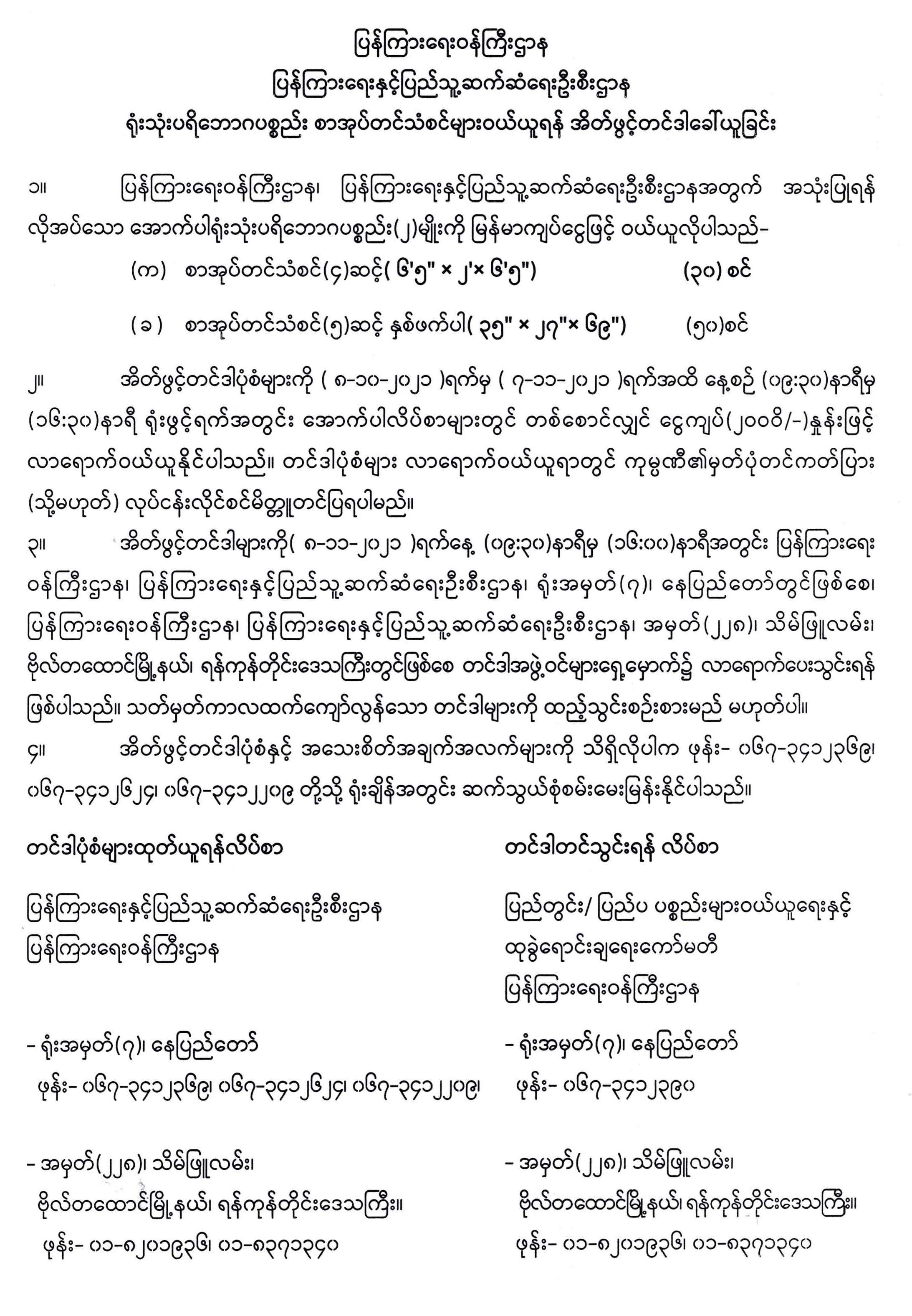 ပြန်ကြားရေးဝန်ကြီးဌာန ပြန်ကြားရေးနှင့်ပြည်သူ့ဆက်ဆံရေးဦးစီးဌာ ရုံးသုံးပရိဘောဂပစ္စည်း စာအုပ်တင်သံစင်များဝယ်ယူရန် အိတ်ဖွင့်တင်ဒါခေါ်ယူခြင်း