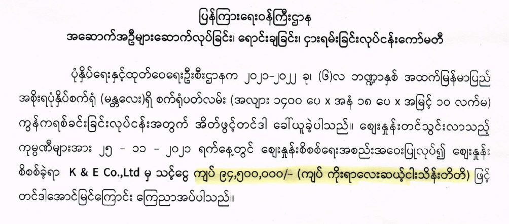 အဆောက်အဦများ ဆောက်လုပ်ခြင်း၊ ရောင်းချခြင်း၊ ငှားရမ်းခြင်း လုပ်ငန်းကော်မတီ တင်ဒါအောင်မြင်ကြောင်း ကြေညာခြင်း