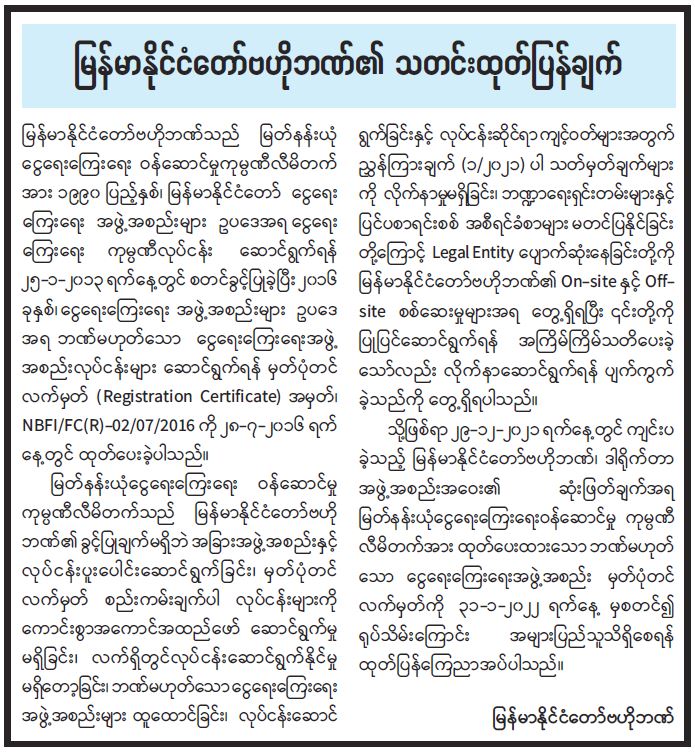 သို့ဖြစ်ရာ ၂၉-၁၂-၂၀၂၁ ရက်နေ့တွင် ကျင်းပ ခဲ့သည့် မြန်မာနိုင်ငံတော်ဗဟိုဘဏ်၊ ဒါရိုက်တာ အဖွဲ့ အစည်းအဝေး၏ ဆုံးဖြတ်ချက်အရ မြတ်နန်းယုံငွေရေးကြေးရေးဝန်ဆောင်မှု ကုမ္ပဏီ လီမိတက်အား ထုတ်ပေးထားသော ဘဏ်မဟုတ်သော ငွေရေးကြေးရေးအဖွဲ့ အစည်း မှတ်ပုံတင် လက်မှတ်ကို ၃၁-၁-၂၀၂၂ ရက်နေ့ မှစတင်၍ ရုပ်သိမ်းကြောင်း အများပြည်သူသိရှိစေရန် ထုတ်ပြန်ကြေညာအပ်ပါသည်။