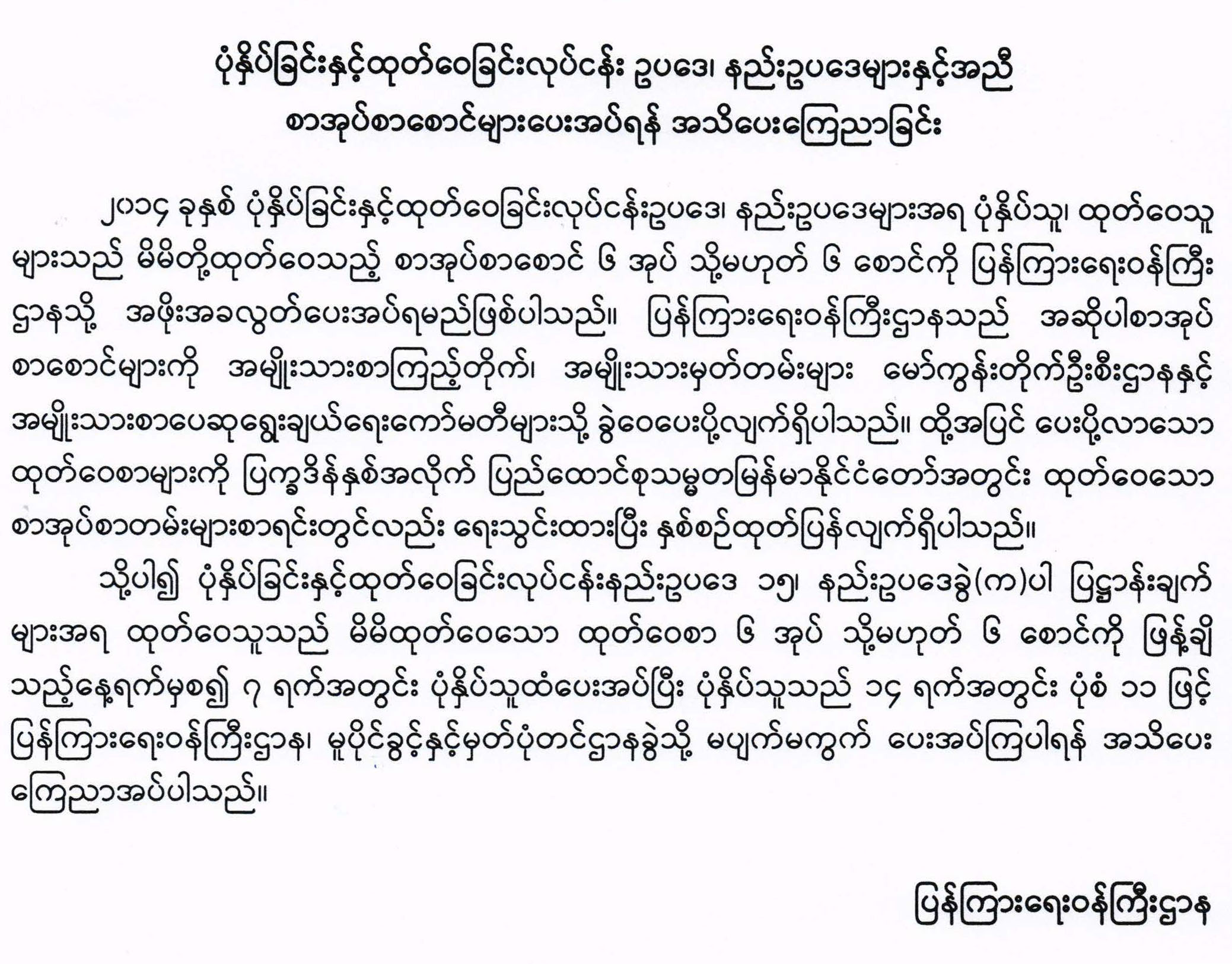 ပုံနှိပ်ခြင်းနှင့်ထုတ်ဝေခြင်းလုပ်ငန်း ဥပဒေ၊ နည်းဥပဒေများနှင့်အညီ စာအုပ်စာစောင်များပေးအပ်ရန် အသိပေးကြေညာခြင်း