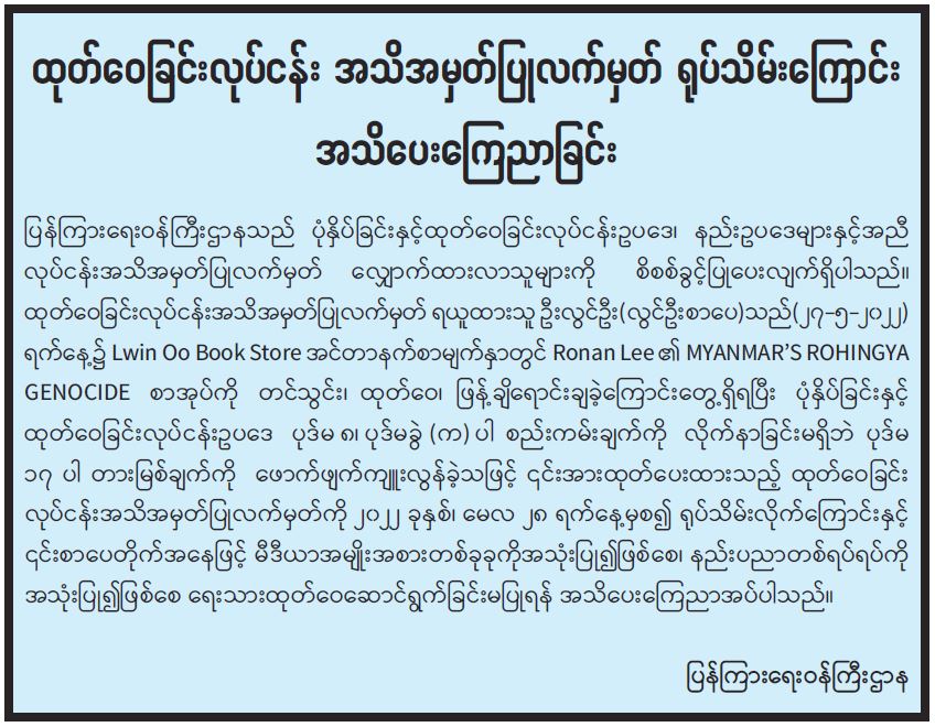 ထုတ်ဝေခြင်းလုပ်ငန်း အသိအမှတ်ပြုလက်မှတ် ရုပ်သိမ်းကြောင်း အသိပေးကြေညာ