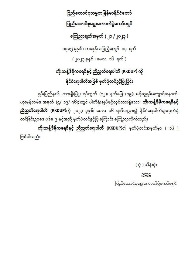 ပြည်ထောင်စုသမ္မတမြန်မာနိုင်ငံတော်၊ ပြည်ထောင်စုရွေးကောက်ပွဲကော်မရှင် ကြေညာချက်အမှတ် (၂၁ / ၂၀၂၃) 05/16/2023 ပြည်ထောင်စုသမ္မတမြန်မာနိုင်ငံတော်၊ ပြည်ထောင်စုရွေးကောက်ပွဲကော်မရှင် ကြေညာချက်အမှတ် (၂၁ / ၂၀၂၃)