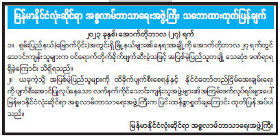 မြန်မာနိုင်ငံလုံးဆိုင်ရာ အစ္စလာမ်ဘာသာရေးအဖွဲ့ကြီး၏ သဘာထားထုတ်ပြန်ချက် 10/30/2023 မြန်မာနိုင်ငံလုံးဆိုင်ရာ အစ္စလာမ်ဘာသာရေးအဖွဲ့ကြီး၏ သဘာထားထုတ်ပြန်ချက်