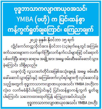 ဗုဒ္ဓဘာသာကလျာဏယုဝအသင်း YMBA (ဗဟို) က ပြင်းထန်စွာ ကန့်ကွက်ရှုတ်ချကြောင်း ကြေညာချက်