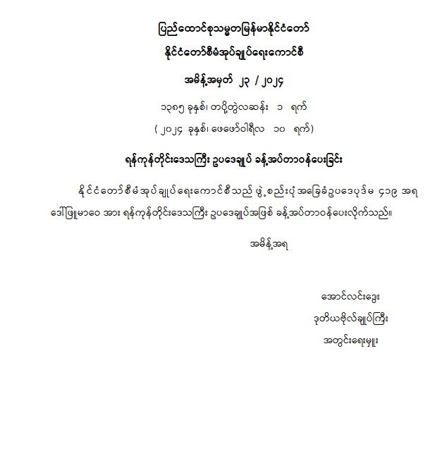 ရန်ကုန်တိုင်းဒေသကြီး ဥပဒေချုပ် ခန့်အပ်တာဝန်ပေးခြင်း