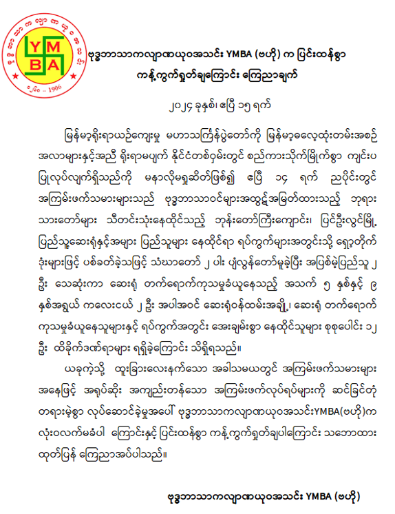 ဗုဒ္ဓဘာသာကလျာဏယုဝအသင်းYMBA (ဗဟို)က ပြင်းထန်စွာ ကန့်ကွက်ရှုတ်ချကြောင်း ကြေညာချက်