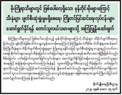 မိုးကြိုရာသီများတွင် ဖြစ်ပေါ်လေ့ရှိသော မုန်တိုင်းမိုးများကြောင့် သီးနှံများ ပျက်စီးဆုံးရှုံးမှုမရှိစေရေး ကြိုတင်ပြင်ဆင်ရေးလုပ်ငန်းများ ဆောင်ရွက်နိုင်ရန် တောင်သူလယ်သမားများသို့ အကြံပြုနှိုးဆော်ချက်