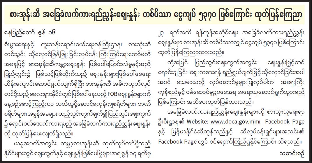 ထို့အပြင် ပြည်တွင်းဈေးကွက်အတွင်း ဈေးနှုန်းမြှင့်တင်ရောင်းချခြင်း၊ ဈေးကစားရန် ရည်ရွယ်ချက်ဖြင့် သိုလှောင်ခြင်းအပါအဝင် မသမာသည့် လုပ်ဆောင်မှုများပြုလုပ်ပါက အရေးကြီးကုန်စည်နှင့်ဝန်ဆောင်မှုဥပဒေအရ အရေးယူဆောင်ရွက်သွားမည်ဖြစ်ကြောင်း အသိပေးထုတ်ပြန်ထားသည်။