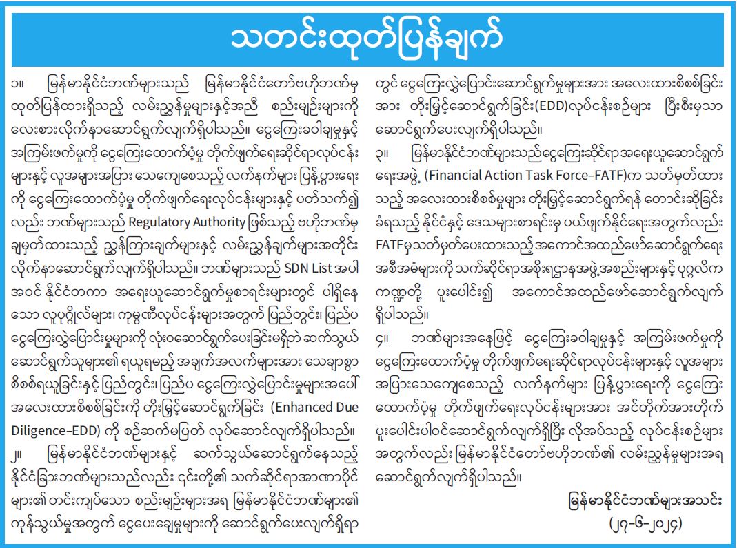 ၁။ မြန်မာနိုင်ငံဘဏ်များသည် မြန်မာနိုင်ငံတော်ဗဟိုဘဏ်မှ ထုတ်ပြန်ထားရှိသည့် လမ်းညွှန်မှုများနှင့်အညီ စည်းမျဉ်းများကို လေးစားလိုက်နာဆောင်ရွက်လျက်ရှိပါသည်။ ငွေကြေးခဝါချမှုနှင့်အကြမ်းဖက်မှုကို ငွေကြေးထောက်ပံ့မှု တိုက်ဖျက်ရေးဆိုင်ရာလုပ်ငန်းများနှင့် လူအများအပြား သေကျေစေသည့် လက်နက်များပြန့်ပွားရေးကို ငွေကြေးထောက်ပံ့မှု တိုက်ဖျက်ရေးလုပ်ငန်းများနှင့်ပတ်သက်၍လည်း ဘဏ်များသည် Regulatory Authority ဖြစ်သည့် ဗဟိုဘဏ်မှချမှတ်ထားသည့် ညွှန်ကြားချက်များနှင့် လမ်းညွှန်ချက်များအတိုင်း လိုက်နာဆောင်ရွက်လျက်ရှိပါသည်။ ဘဏ်များသည် SDN List အပါအဝင် နိုင်ငံတကာ အရေးယူဆောင်ရွက်မှုစာရင်းများတွင် ပါရှိနေသော လူပုဂ္ဂိုလ်များ၊ ကုမ္ပဏီလုပ်ငန်းများအတွက် ပြည်တွင်း၊ ပြည်ပငွေကြေးလွှဲပြောင်းမှုများကို လုံးဝဆောင်ရွက်ပေးခြင်းမရှိဘဲ ဆက်သွယ်ဆောင်ရွက်သူများ၏ ရယူရမည့်အချက်အလက်များအား သေချာစွာစိစစ်ရယူခြင်းနှင့် ပြည်တွင်း၊ ပြည်ပငွေကြေးလွှဲပြောင်းမှုများအပေါ် အလေးထားစိစစ်ခြင်းကို တိုးမြှင့်ဆောင်ရွက်ခြင်း (Enhanced Due Diligence-EDD) ကို စဉ်ဆက်မပြတ် လုပ်ဆောင်လျက်ရှိပါသည်။