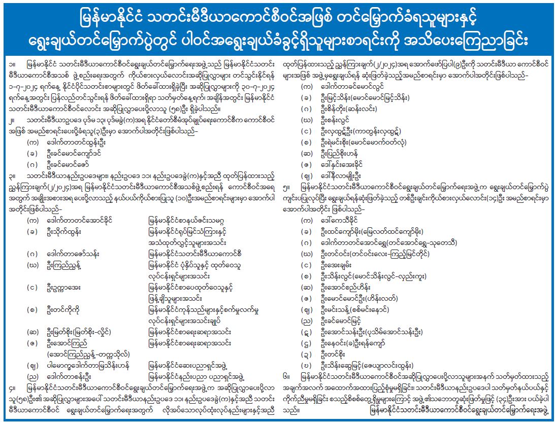 မြန်မာနိုင်ငံသတင်းမီဒီယာကောင်စီဝင်အဖြစ် တင်မြှောက်ခံရသူများနှင့်ရွေးချယ်တင်မြှောက်ပွဲတွင် ပါဝင်အရွေးချယ်ခံခွင့်ရှိသူများစာရင်းကို အသိပေးကြေညာခြင်း