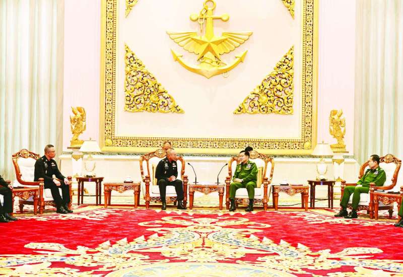 နိုင်ငံတော်လုံခြုံရေးနှင့်အေးချမ်းသာယာရေးကော်မရှင်ဥက္ကဋ္ဌ တပ်မတော်ကာကွယ်ရေးဦးစီးချုပ် ဗိုလ်ချုပ်မှူးကြီး မင်းအောင်လှိုင်သည် ထိုင်းဘုရင့်တပ်မတော် ကာကွယ်ရေးဦးစီးချုပ် General Ukris Boontanondha ဦးဆောင်သည့် ကိုယ်စားလှယ်အဖွဲ့အား ယနေ့နံနက်ပိုင်းတွင် နေပြည်တော်ရှိ ဇေယျာသီရိဗိမာန် ဧည့်ခန်းမဆောင်၌ လက်ခံတွေ့ဆုံသည်။