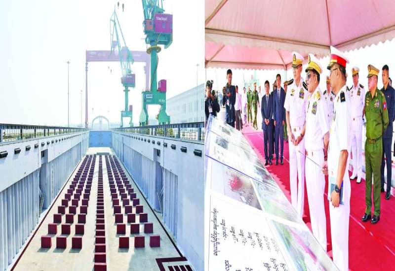 တပ်မတော်(ရေ)မှ ရေတပ်သင်္ဘောကျင်းဌာနချုပ် တန် ၄၀၀၀၀ ရေလုံလွန်းကျင်း ဖွင့်ပွဲအခမ်းအနား၊ ရေငုပ်သင်္ဘောတိုက်ဖျက်ရေးရေယာဉ်များ၏ ဧရာခင်းမင်္ဂလာအခမ်းအနားနှင့် စစ်ရေယာဉ်များ တပ်တော်ဝင်ခြင်းအခမ်းအနားများအား ယနေ့နံနက်ပိုင်းတွင် သန်လျင်တပ်နယ် ရေတပ်သင်္ဘောကျင်းဌာနချုပ် တန် ၄၀၀၀၀ ရေလုံလွန်းကျင်း တည်ဆောက်ရေးအလုပ်ရုံနှင့် ရေတပ်ဆိပ်ခံတံတားတို့၌ကျင်းပရာ နိုင်ငံတော်လုံခြုံရေးနှင့်အေးချမ်းသာယာရေးကော်မရှင်ဥက္ကဋ္ဌ တပ်မတော်ကာကွယ်ရေးဦးစီးချုပ် ဗိုလ်ချုပ်မှူးကြီးမင်းအောင်လှိုင် တက်ရောက်ချီးမြှင့်သည်။