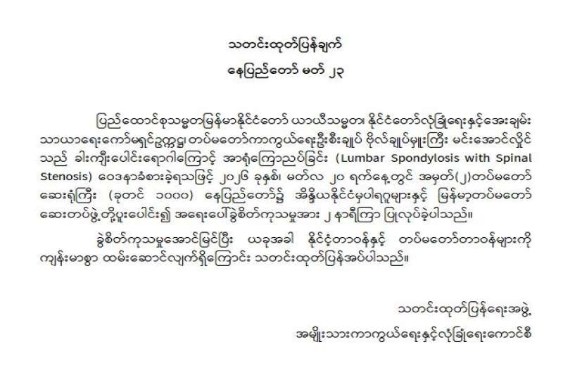 ၂၀၂၆ ခုနှစ် (၈၁)နှစ်မြောက် တပ်မတော်နေ့ကို ကြိုဆိုဂုဏ်ပြုသည့်အနေဖြင့် ရန်ကုန်တိုင်းဒေသကြီး ဒဂုံမြို့သစ်(ဆိပ်ကမ်း)မြို့နယ်အမျိုးသားကင်ဆာကုသရေးဗဟိုဌာန (National Cancer Center - NCC) ဖွင့်ပွဲအခမ်းအနားကို ယနေ့နံနက်ပိုင်းတွင် ကျင်းပပြုလုပ်ရာ ပြည်ထောင်စုသမ္မတမြန်မာနိုင်ငံတော်ယာယီသမ္မတ နိုင်ငံတော်လုံခြုံရေးနှင့် အေးချမ်းသာယာရေးကော်မရှင်ဥက္ကဋ္ဌ ဗိုလ်ချုပ်မှူးကြီး မင်းအောင်လှိုင် တက်ရောက်ချီးမြှင့် ဖွင့်လှစ်ပေးသည်။