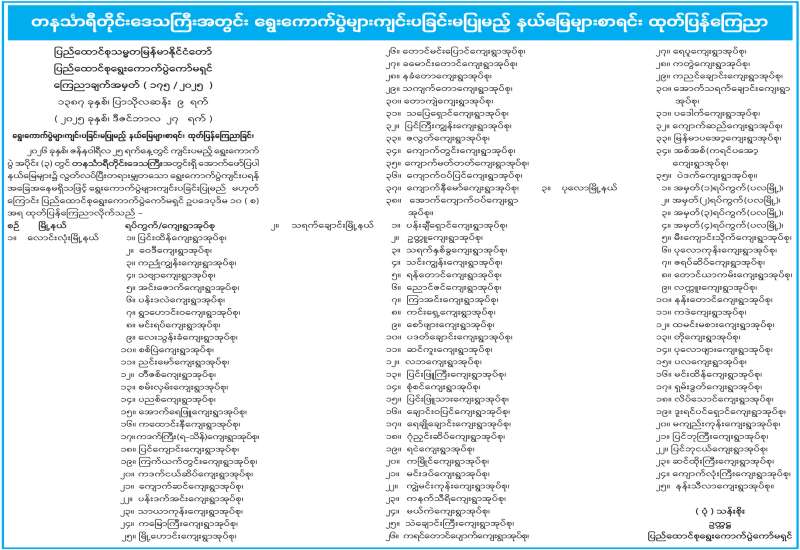 တနင်္သာရီတိုင်းဒေသကြီးအတွင်း ရွေးကောက်ပွဲများကျင်းပခြင်းမပြုမည့် နယ်မြေများစာရင်း ထုတ်ပြန်ကြေညာ