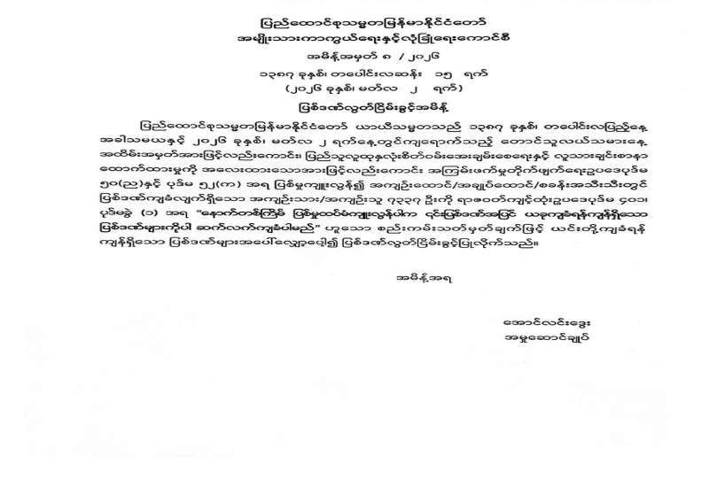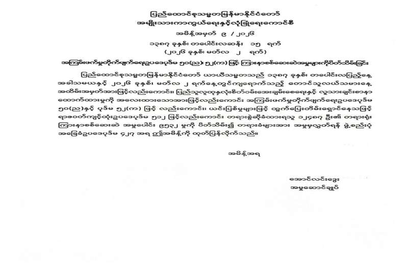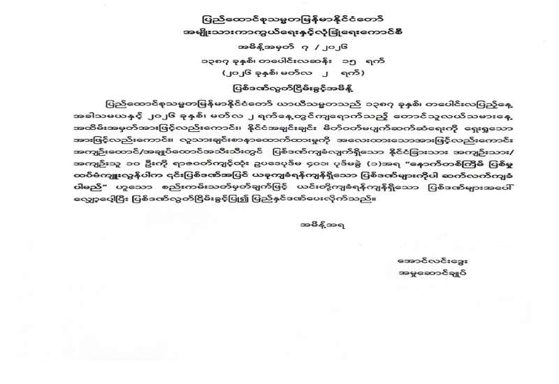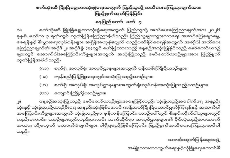 စက်သုံးဆီ ခြိုးခြံချွေတာသုံးစွဲရေးအတွက် ပြည်သူသို့ အသိပေးကြေညာချက်အား ဖြည့်စွက်ထုတ်ပြန်ခြင်း