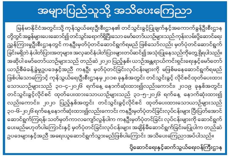 အများပြည်သူသို့ အသိပေးကြေညာ