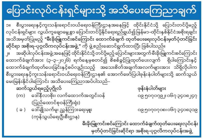 စက်သုံးဆီ ခြိုးခြံချွေတာသုံးစွဲရေးအတွက် ပြည်သူသို့ အသိပေးကြေညာချက်