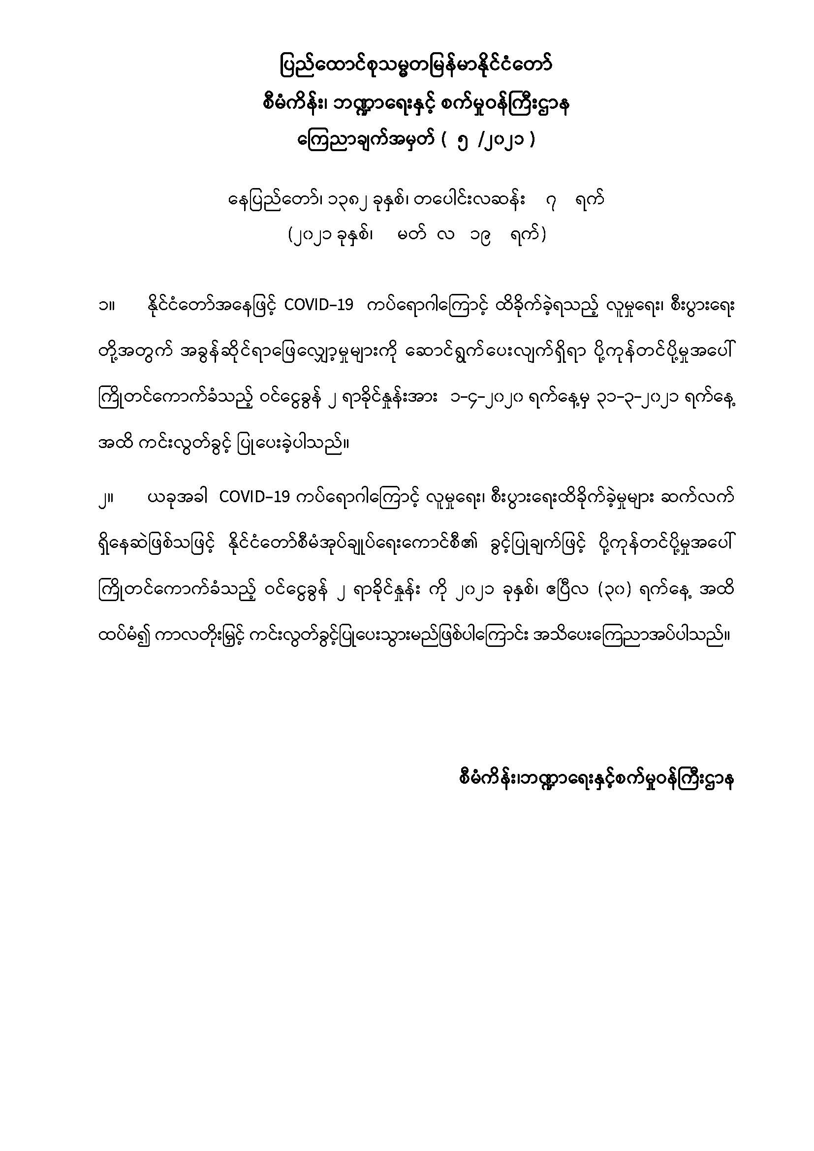 ပြည်ထောင်စုသမ္မတမြန်မာနိုင်ငံတော် စီမံကိန်း၊ ဘဏ္ဍာရေးနှင့် စက်မှုဝန်ကြီးဌာန ကြေညာချက်အမှတ် ( ၅ /၂၀၂၁ ) နေပြည်တော်၊ ၁၃၈၂ ခုနှစ်၊ တပေါင်းလဆန်း ၇ ရက် (၂၀၂၁ ခုနှစ်၊ မတ် လ ၁၉ ရက်) 03/19/2021