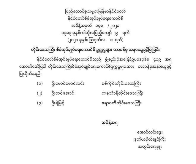 တိုင်းဒေသကြီး စီမံအုပ်ချုပ်ရေးကောင်စီ ဥက္ကဋ္ဌများ တာဝန်မှ အနားယူခွင့်ပြုခြင်း