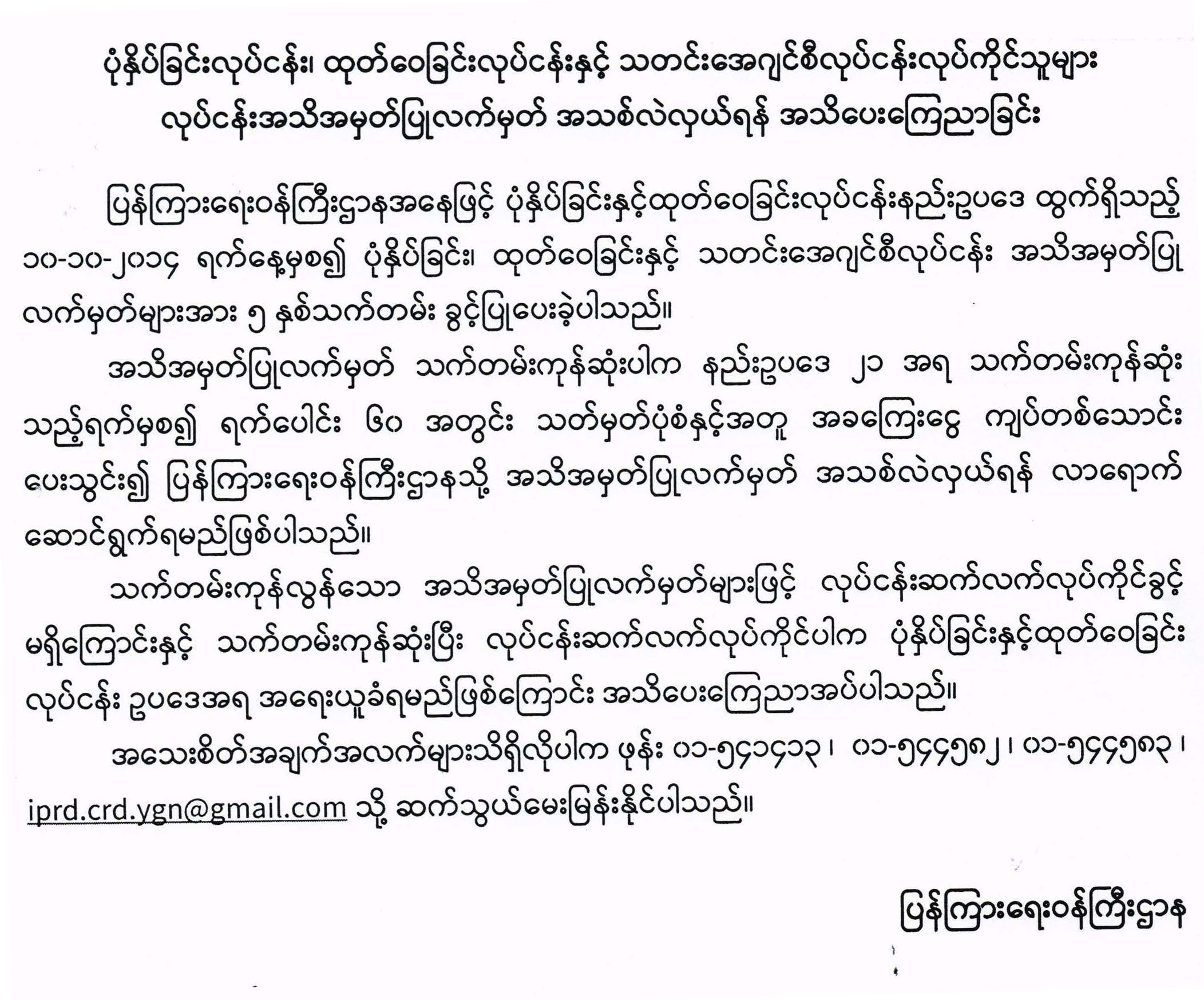 ပုံနှိပ်ခြင်းလုပ်ငန်း၊ ထုတ်ဝေခြင်းလုပ်ငန်းနှင့် သတင်းအေဂျင်စီလုပ်ငန်း လုပ်ကိုင်သူများ လုပ်ငန်း အသိအမှတ်ပြုလက်မှတ် အသစ်လဲလှယ်ရန် အသိပေးကြေညာခြင်း