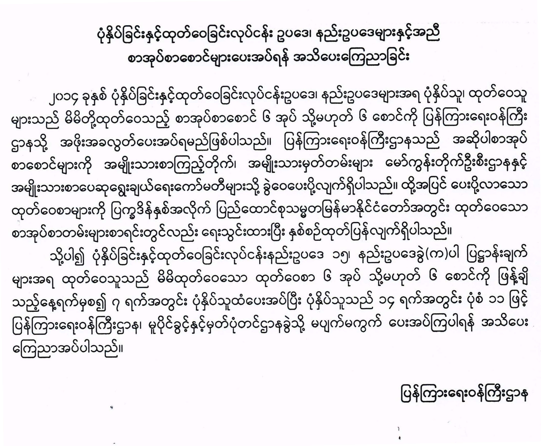 ပုံနှိပ်ခြင်းနှင့် ထုတ်ဝေခြင်းလုပ်ငန်း ဥပဒေ၊ နည်းဥပဒေများနှင့်အညီ စာအုပ်စာစောင်များပေးအပ်ရန် အသိပေးကြေညာခြင်း