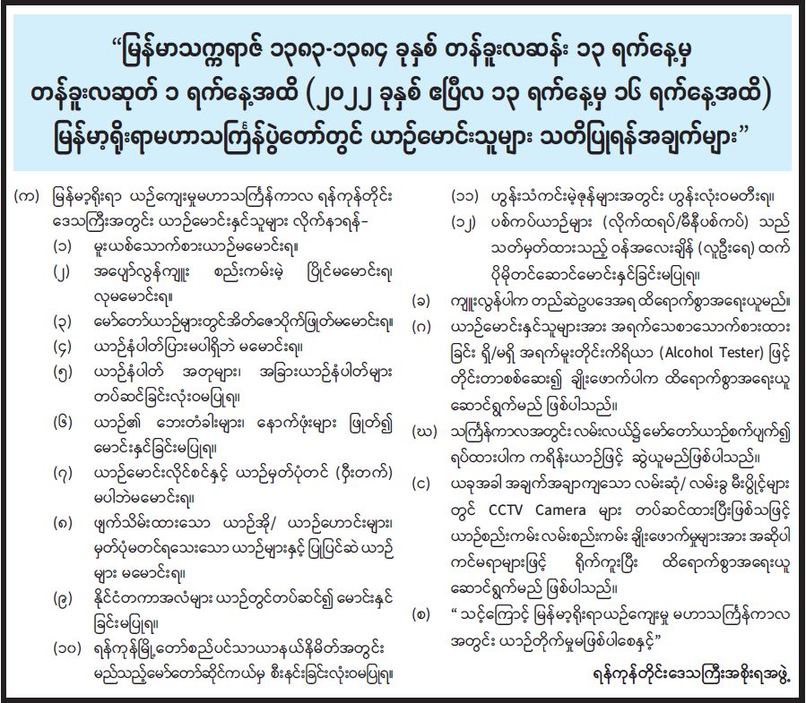“ မြန်မာ့သက္ကရာဇ် ၁၃၈၃-၁၃၈၄ ခုနှစ် တန်ခူးလဆန်း ၁၃ ရက်နေ့မှ တန်ခူးလဆုတ် ၁ရက်နေ့အထိ (၂၀၂၂ ခုနှစ် ဧပြီလ ၁၃ ရက်နေ့မှ ၁၆ရက်နေ့အထိ) မြန်မာ့ရိုးရာမဟာသင်္ကြန်ပွဲတော်တွင် ယာဉ်မောင်းသူများ သတိပြုရန်အချက်များ