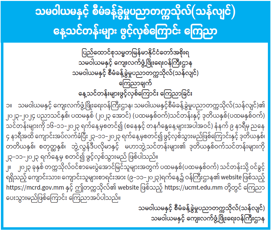 သမဝါယမနှင့် စီမံခန့်ခွဲမှုပညာတက္ကသိုလ်(သန်လျင်)နေ့သင်တန်းများ ဖွင့်လှစ်ကြောင်း ကြေညာ 11/10/2023 သမဝါယမနှင့် စီမံခန့်ခွဲမှုပညာတက္ကသိုလ်(သန်လျင်)နေ့သင်တန်းများ ဖွင့်လှစ်ကြောင်း ကြေညာ